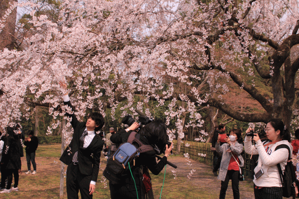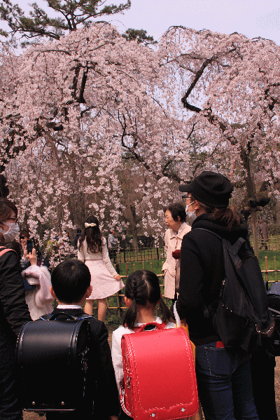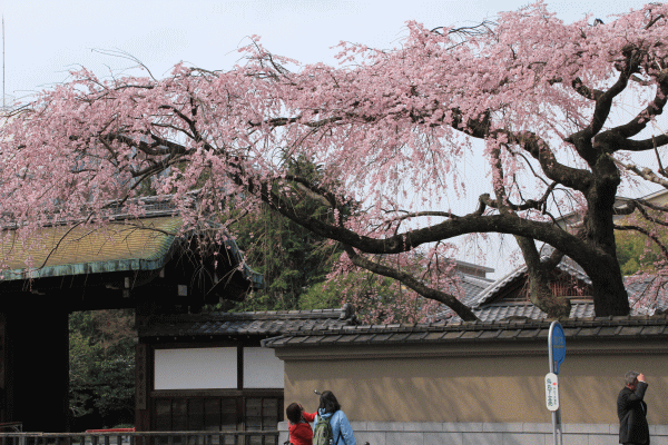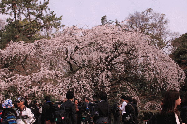 するとなんとラッキーなことか、両陛下が近衛邸後の有名な枝垂れ桜をご覧になりに御所からお出ましに。