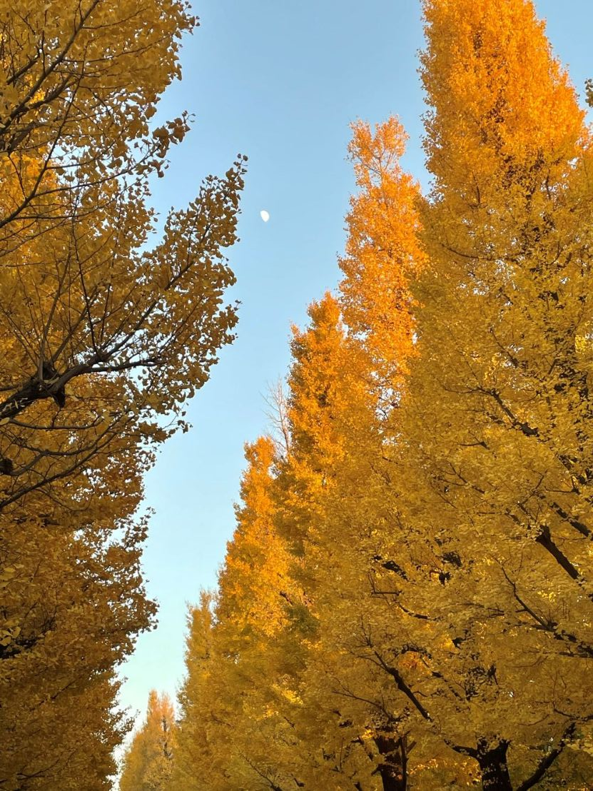 青空、イチョウ、上弦の月・・・役者が揃ったところで急いでシャッターを切りました。秋もそろそろ終わりです。