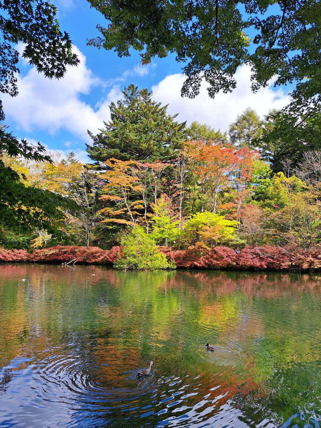 紅葉時の雲場池は木々の葉が水面に写り込み、水鏡となって特に綺麗。