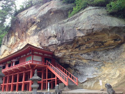 達谷窟毘沙門堂(たっこくのいわやびしゃもんどう)です。坂上田村麻呂が征夷の記念に毘沙門天を祀った岩窟だ そうです。